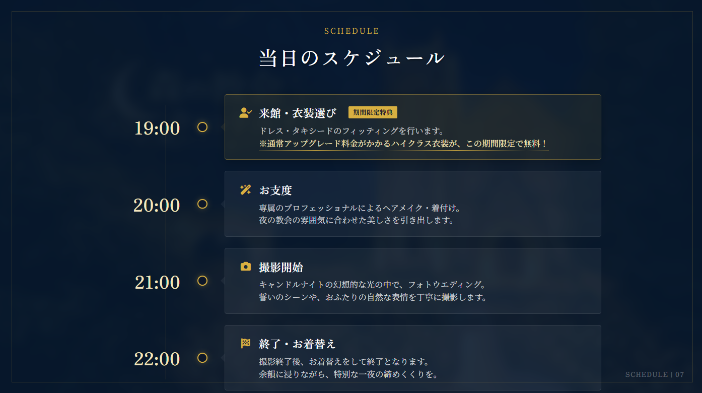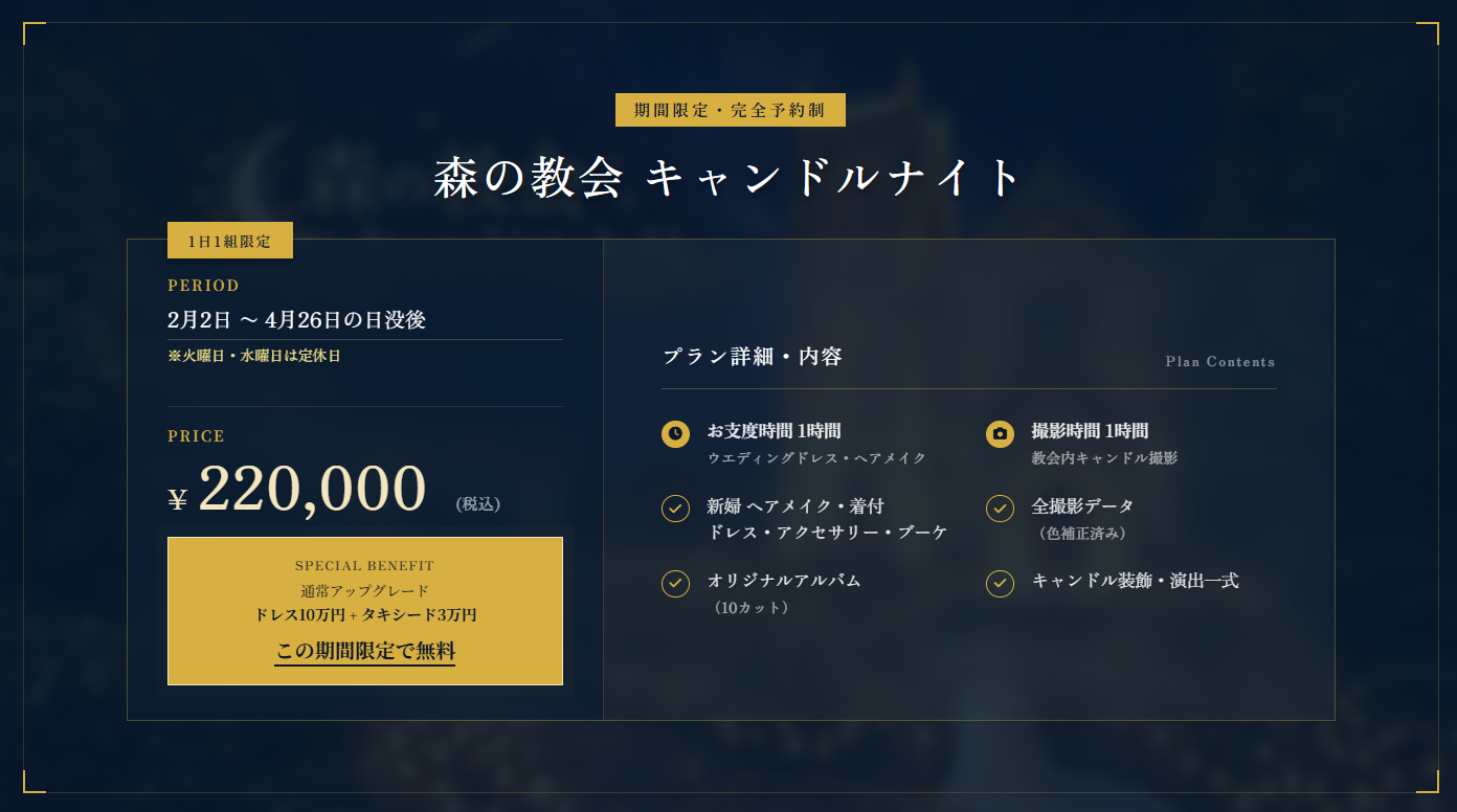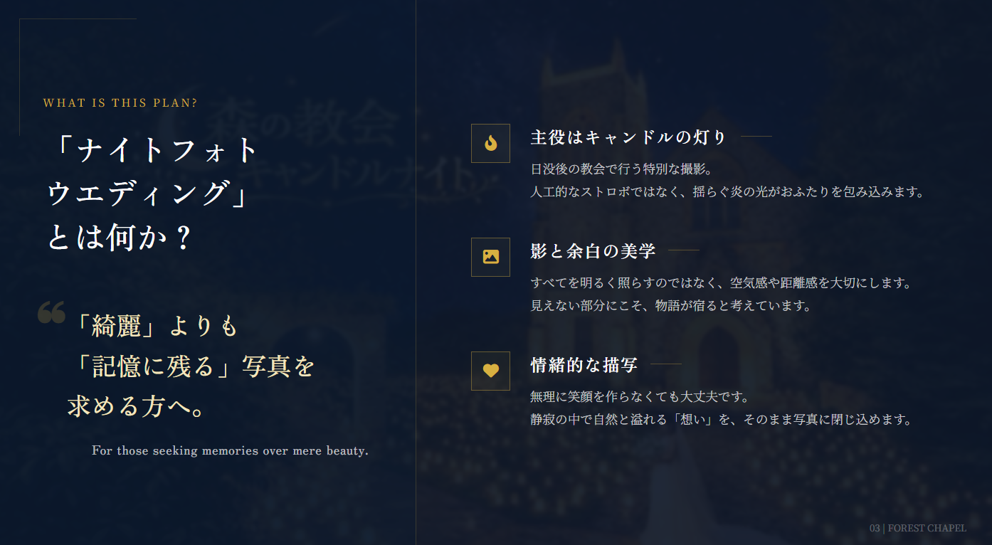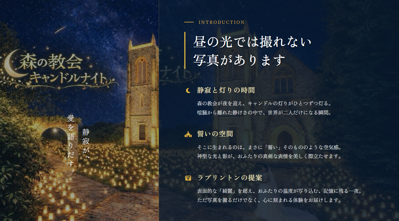「灯りが願いを包む夜 ― 森の教会で始まる、ナイトフォトウエディング」